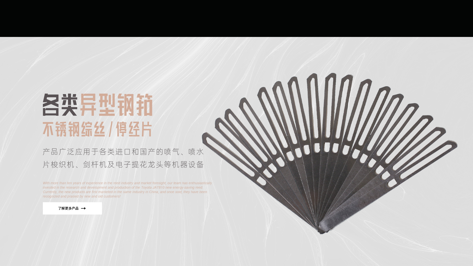 憑借十多年鋼筘行業(yè)經(jīng)驗及對市場的前瞻性,我們團隊滿懷熱情的投入到豐田JAT810新型節(jié)能鋼筘的研發(fā)和生產(chǎn)當中,目前新產(chǎn)品在國內(nèi)同行業(yè)中先行上市銷售,一經(jīng)銷售就得到了新老客戶的認可和好評!